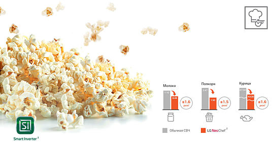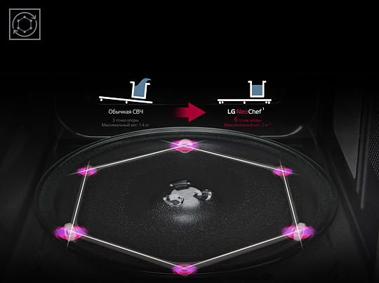 Внутренняя LED-подсветка белого цвета в 3 раза¹ ярче, чем в традиционных моделях, что помогает контролировать процесс приготовления пищи без открывания дверцы микроволновой печи и обеспечивает меньшее потребление электроэнергии.